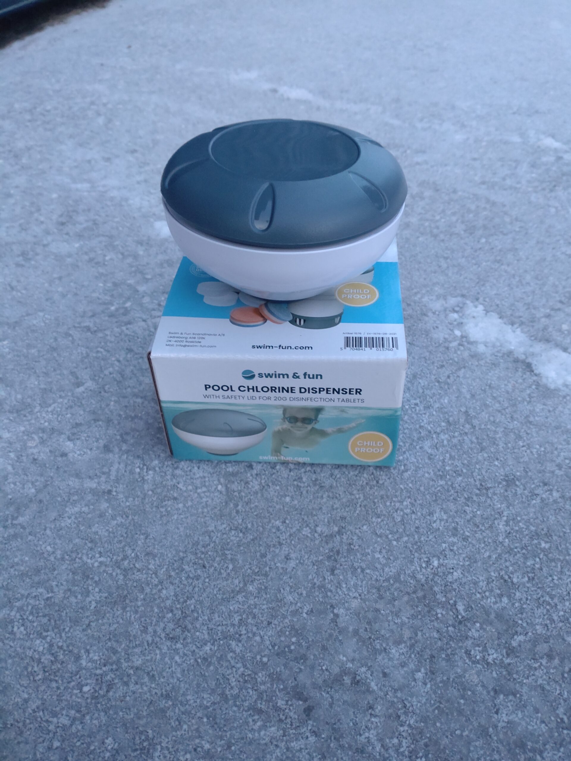 Dispensern flyter i poolen medan den långsamt doserar ut combi tabs i vattnet.